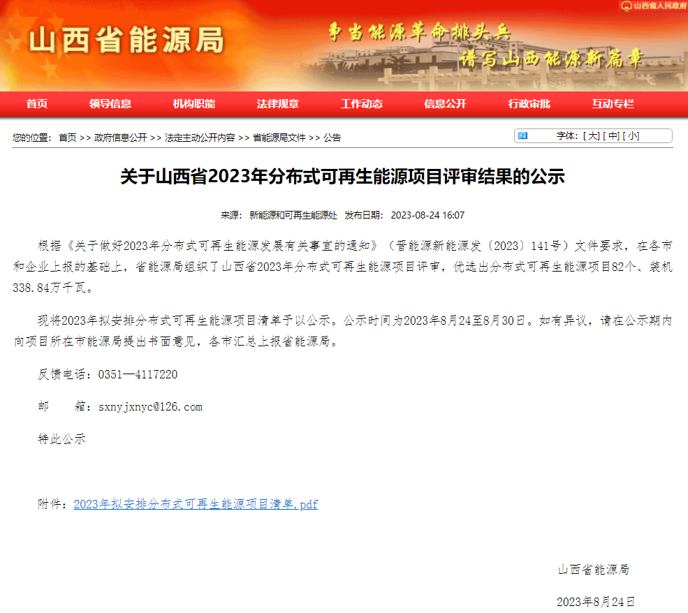 讯:8月24日,山西能源局发布《关于山西省2023年分布式可再生能源项目评审结果的公示》。根据公示,共优选出82个分布式可再生能源项目,总装机规模338.84万千瓦。其中,风电项目共计约3GW,光伏项目共计约422MW。